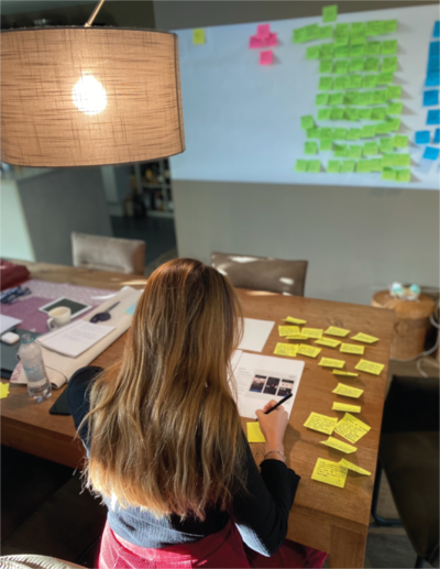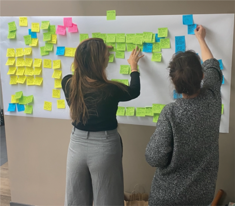 All post-its go up on the wall. First we hung the sticky notes per project.