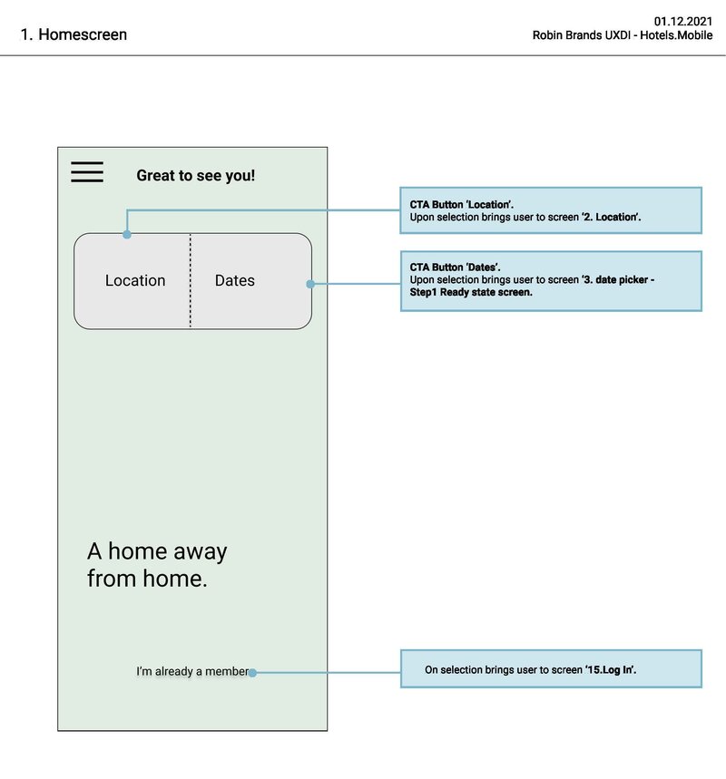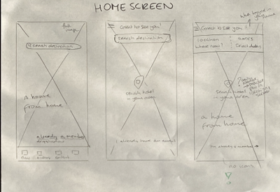 Examples of the development of screens Homescreen and Hotel front page from low fidelity wireframe to interactive prototype:
