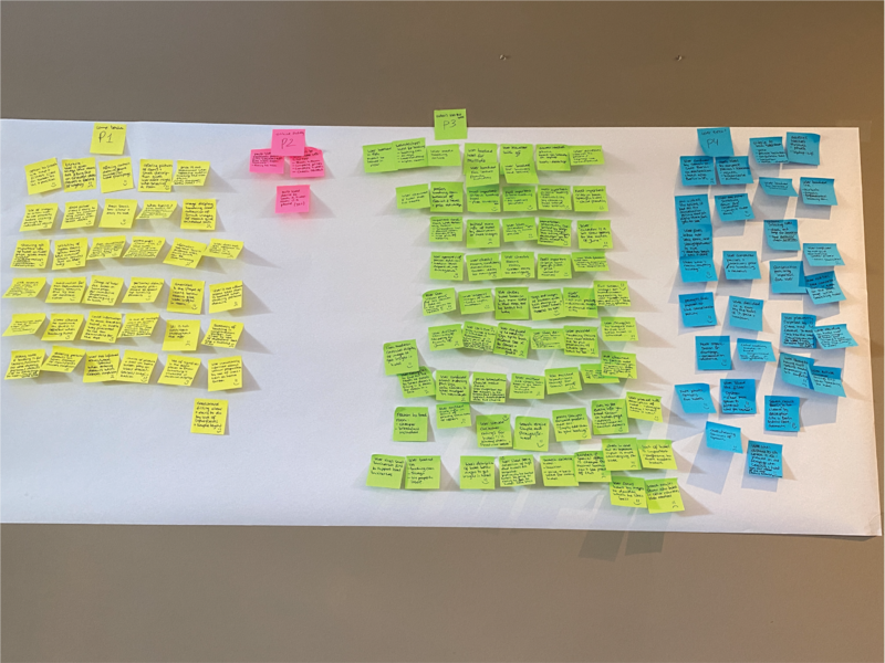 I noted down the data of each project on a different color sticky note, one observation per post-it. Adding a happy smiley for a positive user experience, a sad smiley for a user painpoint.